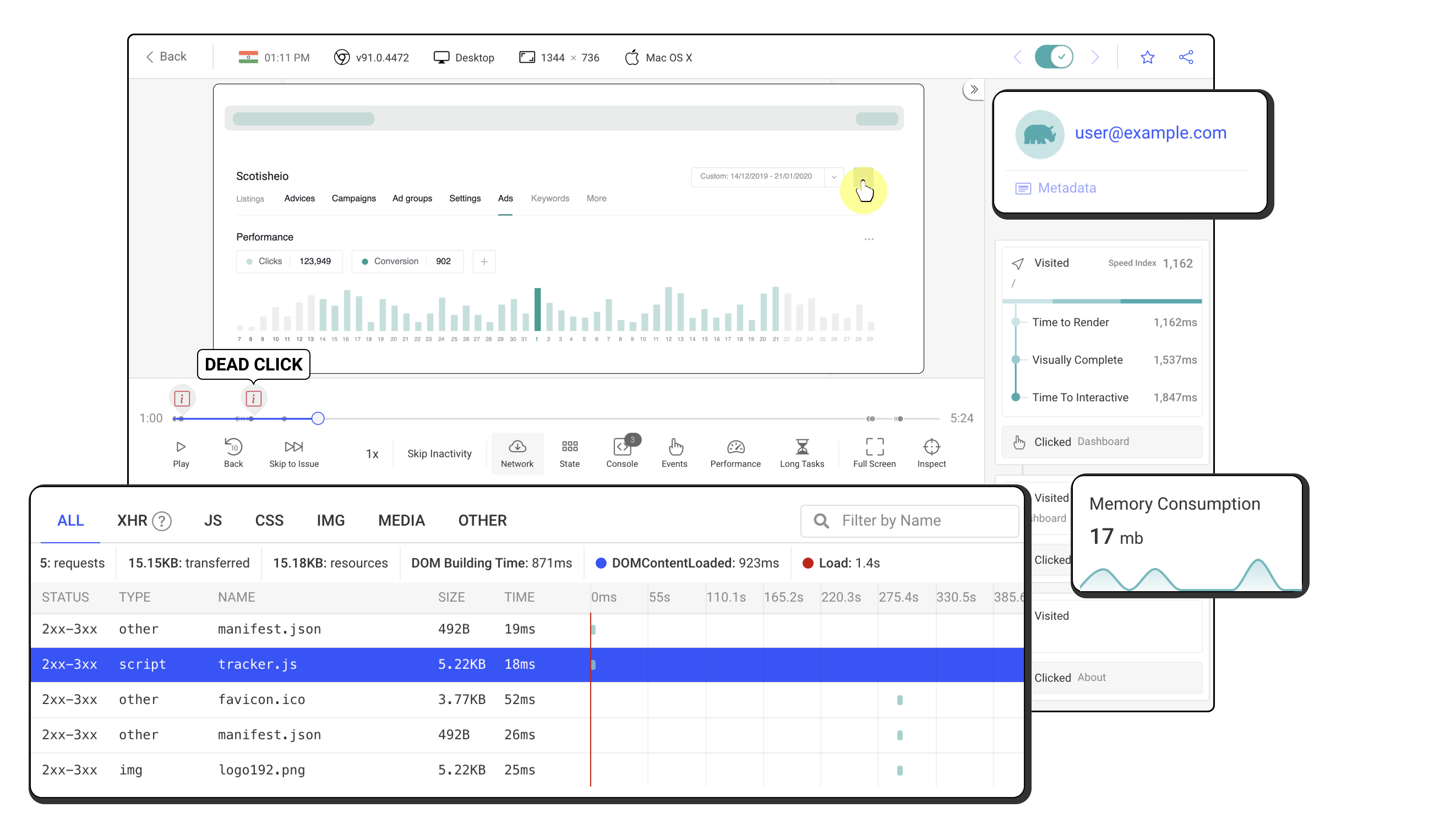 • Session replay: Lets you relive your users' experience, see where they struggle and how it affects their behavior. Each session replay is automatically analyzed based on heuristics, for easy triage.